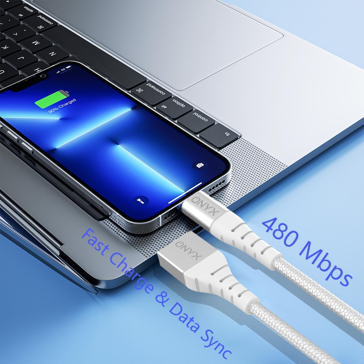 VELOCITÀ DI TRASFERIMENTO DATI OTTIMALE: Il cavo Lightning ONYX supporta velocità di trasferimento dati elevate, fino a 480 mbps permettendo una rapida sincronizzazione tra il tuo iPhone, iPad e computer. Potrai gestire rapidamente file multimediali, backup e documenti importanti, migliorando la produttività quotidiana. Ideale per professionisti e utenti che necessitano di trasferimenti dati rapidi e affidabili tra dispositivi Apple.