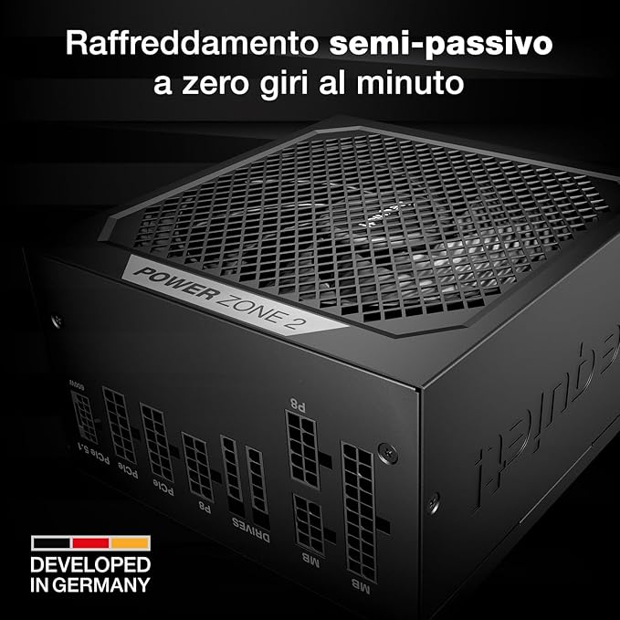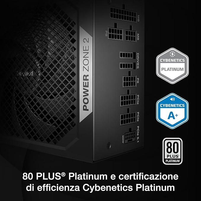 be quiet! POWER ZONE 2 1000W. Potenza totale: 1000 W, Tensione di ingresso AC: 100 - 240 V, Potenza di picco: 1070 W. Connettore scheda madre: 20+4 pin ATX, Lunghezza del cavo di alimentazione della scheda madre: 60 cm, Lunghezza del cavo di alimentazione SATA: 550,700,850,1000 mm. Utilizzo: PC, Fattore di forma dell'unità di alimentazione (PSU): ATX, Certificazione 80 PLUS: 80 PLUS Platinum. Colore del prodotto: Nero, Tipo di raffreddamento: Attivo, Diametro del ventilatore: 14 cm. Certificati di conformità: BSMI, CB, CCC, CE, Federal Communications Commission (FCC), RCM, RoHS, TÜV mark, UKCA, WEEE